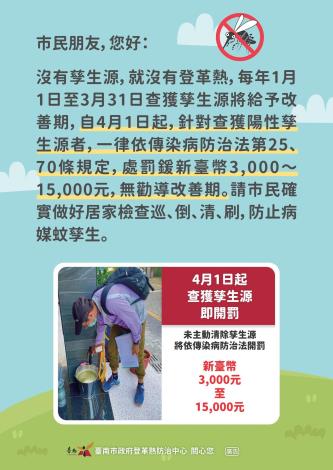 臺南市每年1-3月為登革熱防治衛教宣導期,查獲孳生病媒蚊孑孓,將先勸導清除及防治,並限期改善;4月1日起,民眾如未主動清除積水容器,導致孳生病媒蚊孑孓時,將依傳染病防治法處3千元到1萬5千元罰鍰;提醒您,落實「巡、倒、清、刷」,才能杜絕病媒蚊孳生,公私協力共同對抗登革熱,守護臺南健康家園!