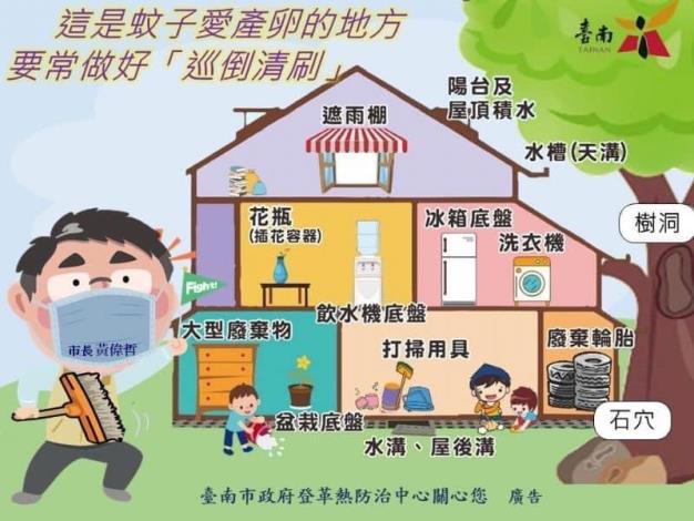 本市公、私場所所有人、管理人或使用人及民眾應主動清除場所內之登革熱及其他孳生源。凡未主動清除者,臺南市政府衛生局依傳染病防治法第70條第1項第1款規定,處新台幣3,000元以上15,000元以下罰鍰。