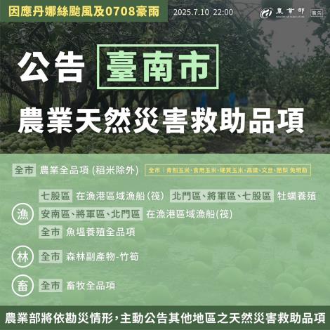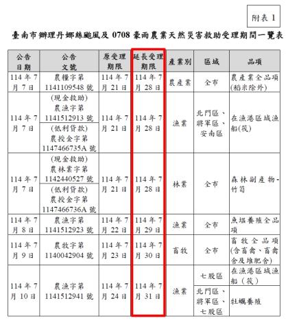 為協助受災農漁民順利完成申請作業,臺南市與嘉義縣辦理之「丹娜絲颱風及0708豪雨農業天然災害現金救助及低利貸款」申請期限延長5個工作日!
