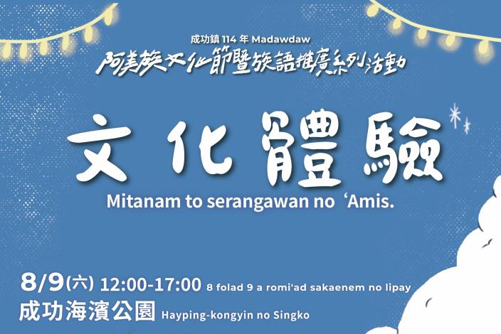 一、活動資訊如下:(一)活動日期:114年8月9日(六)(二)活動時間:下午13:00至下午21:00(三)活動地點:臺東縣成功海濱公園、成功鎮原住民文物館(四)活動內容:1、阿美族傳統舞蹈競賽、阿美族傳統歌謠競賽。2、文化體驗營、部落市集、打卡抽獎趣。3、留言.穿說打開阿美族文化的更衣室策展活動。4、部落嗨一「夏」晚會&璀璨千發煙火秀。二、活動相關資訊請逕上活動粉絲專頁查詢。