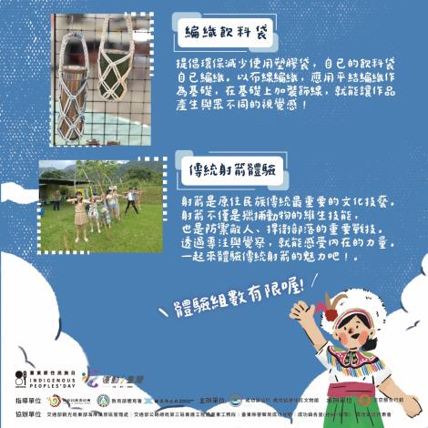 2、文化體驗營、部落市集、打卡抽獎趣。