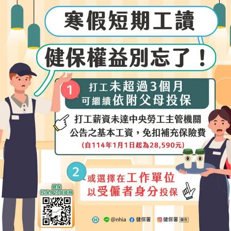 📢寒假快到了,許多學生開始安排打工,不管是在便利商店、補習班還是咖啡廳,都要記得先確認自己的健保身分,保障不中斷,健康更安心!🧑🎓學生寒暑假打工,未超過3個月,可選擇:🔹繼續依附父母投保。🔸或在工作單位以受僱者身分投保。❣️選擇依附父母投保,打工的薪資未達中央勞工主管機關公告之基本工資(自114年1月1日起為28,590元),則免扣補充保險費。📞健保諮詢服務專線:0800-030-598📱手機請撥02-4128-678