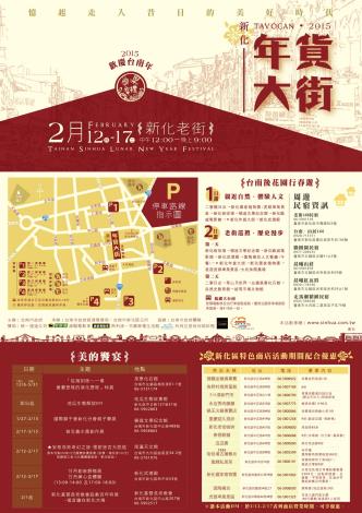 2015歡慶台南年新化年貨大街活動,於104年2月12日~2月17日計6天在新化老街。古色古香的新化老街上集結色、香、味俱全的南北貨、伴手禮、美食小吃及年節百貨等應景的年貨
