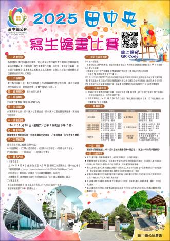一、為展現田中鎮老街景觀、彰化最美紀念母親生態公園與全球最美高鐵車站的景觀之美,訂於114年10月18日(星期六)上午8時至下午2時辦理旨揭寫生繪畫比賽,冀以提升藝術文化風氣,促進親子互動,並推廣本鎮自然與人文之美。
